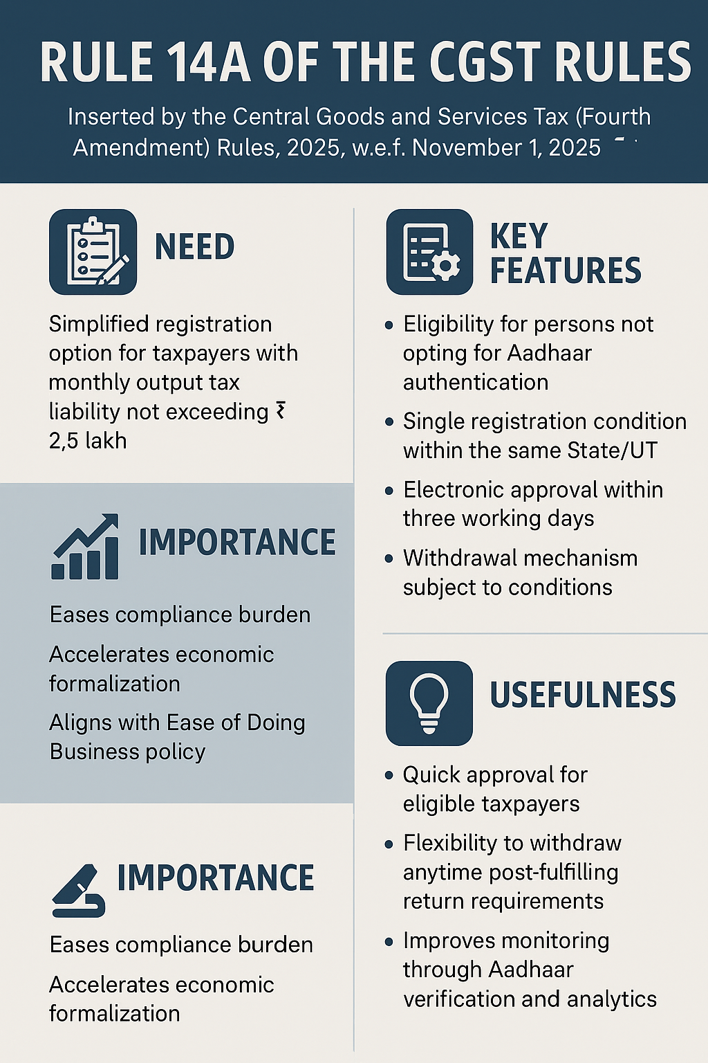 1. Background and Legislative Need The Central Goods and Services Tax (Fourth Amendment) Rules, 2025 (effective 1 November 2025) introduce Rule 14A — a new pathway for simplified GST registration. T ........ View More